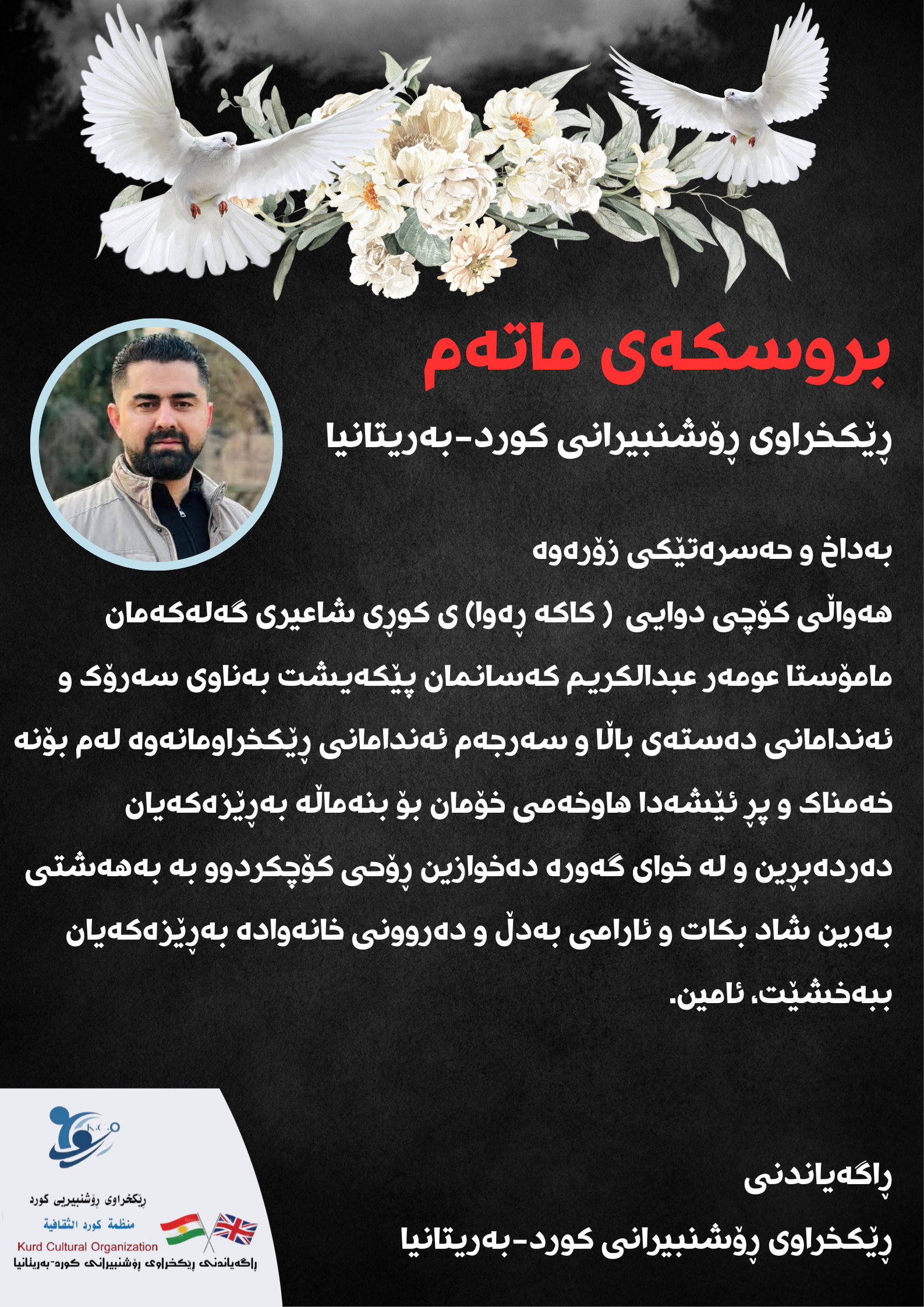 بە دڵێکی پڕ لە خەم و داخەوە، ڕێکخراوی ڕۆشنبیرانی کورد-بەریتانیا هەواڵی پڕ لە تاڵی کۆچی دوایی **کاکە ڕەوا**، کوڕە تاقانەکەی بەڕێز **کاک عومەر عەبدولکەریم کەسان**، نووسەر و شاعیر و ڕۆشنبیری گەورەی گەلی کوردستان، تێکۆشەری دێرین و کەسایەتی عەشیرەتی ئاڵی بەگی جاف مان پێگەیشت و لەناخەوە نیگەرانی کردین.