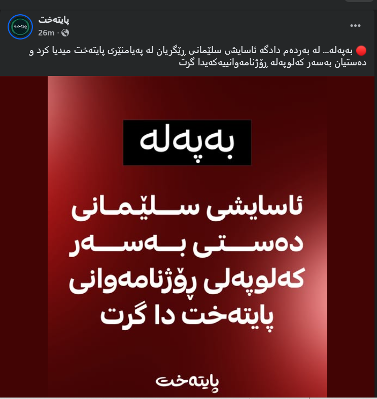 Paytakht Media, a Kurdish media outlet operating in South Kurdistan, was attacked by security forces in front of the Sulaimani Security Court today.