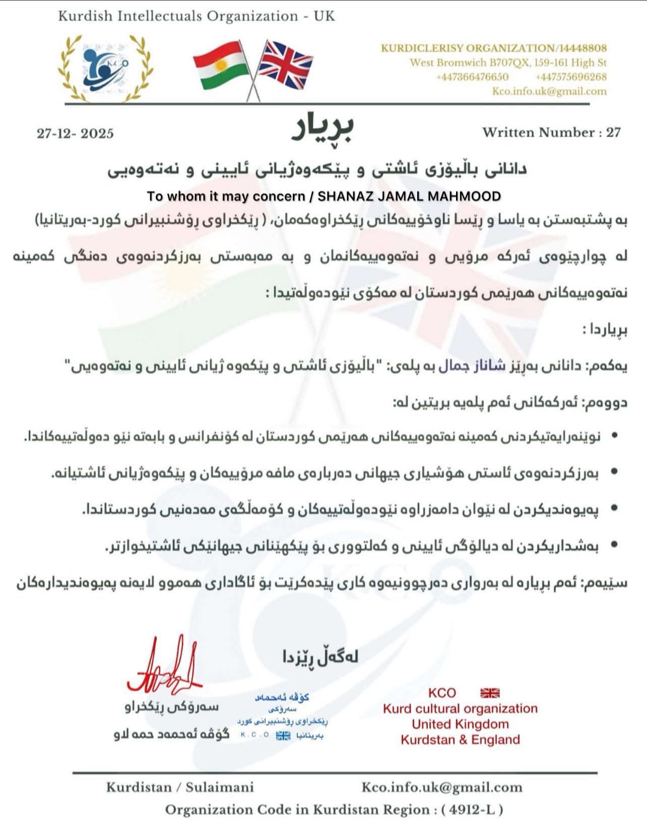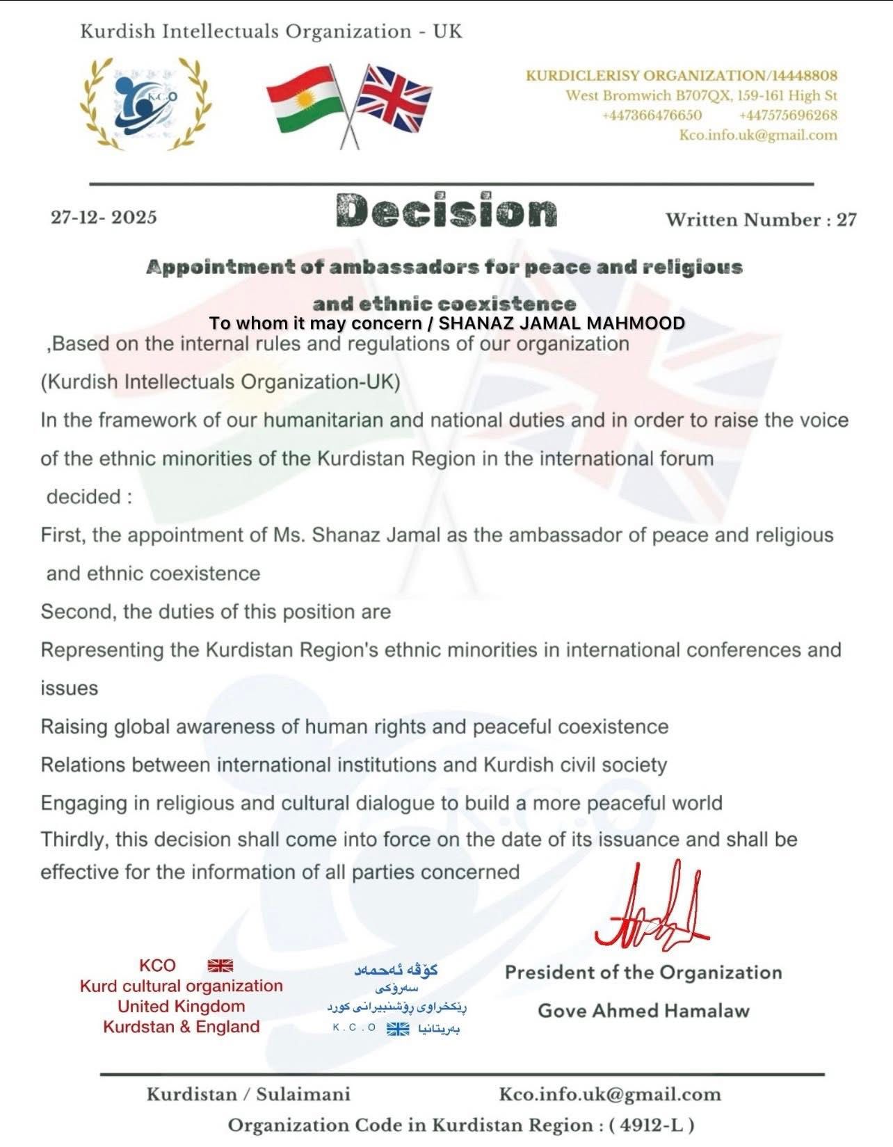 Home/UK NEWS/پیرۆزبایی باڵیۆزی ئاشتی و پێکەوە ژیانی ئاینی و نەتەوەیی، خاتوو شاناز جمال UK NEWSپەنابەرانژنان و پەرەپێدانهونەر و ڕۆشنبیری پیرۆزبایی باڵیۆزی ئاشتی و پێکەوە ژیانی ئاینی و نەتەوەیی، خاتوو شاناز جمال Facebook Messenger Messenger WhatsApp Telegram Viber Share via Email Print Facebook Messenger Messenger WhatsApp Telegram Viber Share via Email Print Show More