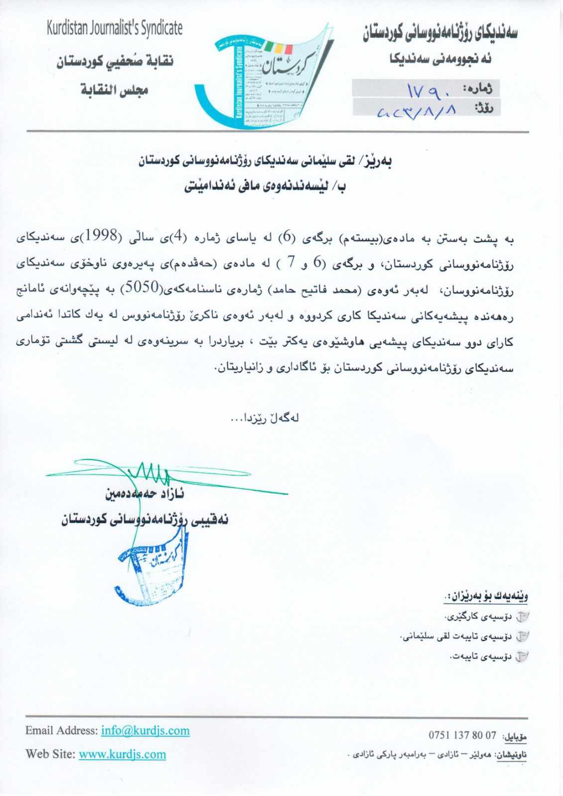 I was an active member of the Kurdistan Union of Journalists. Azad Hama Amin, the deputy head of the Kurdistan Union of Journalists, expelled me after insulting me and deleted my name from the union.